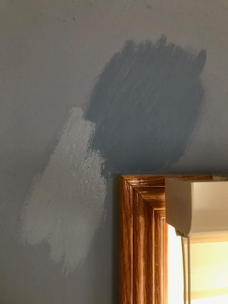 Besides I had this valanceless window in my blue office wall. It has two white patches bracketing the casement. I’d hunt for the can labeled Atmosphere but keep the white paint on hand.