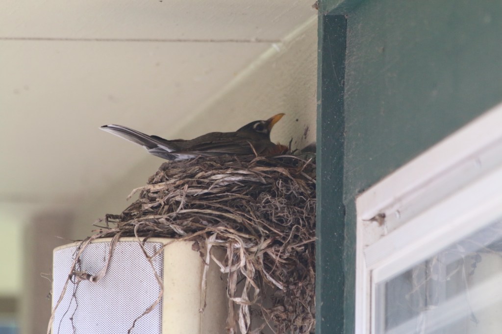 That’s what I named the pair of Turdus migratorius building a nest on the outdoor speaker under my eaves. Mrs. Rockin’ plucked, yanked, and tugged at the dried winter garden debris that I should’ve plucked, yanked, and tugged out of the flowerbed a month ago. With mud for mortar, she recycled the potential compost into a safe haven for her future family.