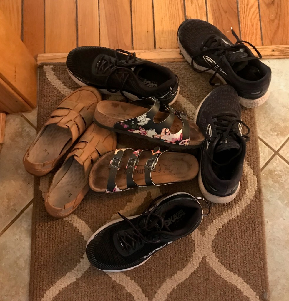 Shucking the inside Hoka sneakers, outside Brooks sneakers, flowery Birkenstocks, New Balance sneakers downgraded to gardening, Sketcher slip-ins upgraded to running errands, and “past their prime on their last legs” (or last feet) Clarks on the mats when I entered, testified to a bad habit.