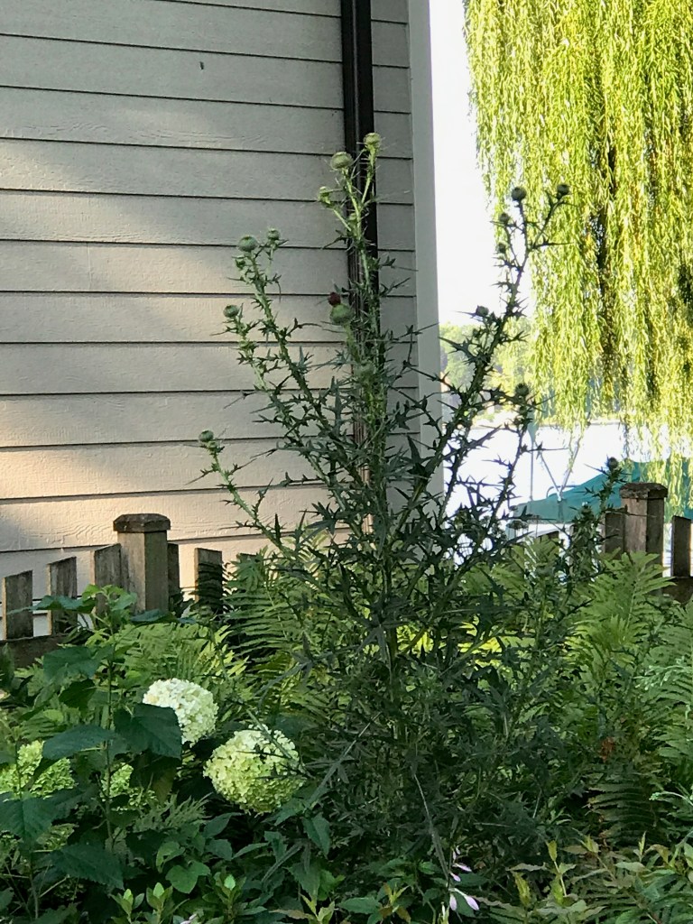 According to my research (Thank you Google!) there were over 200 species of thistle. The Bull Thistle loomed over my perennials. A thorny stem distinguished it from other Illinois thistle species. Thorns not only covered the stems, but each leaf ended in a spike. I’d need to suit up in armor and don titanium lined gloves to extract THIS interloper.