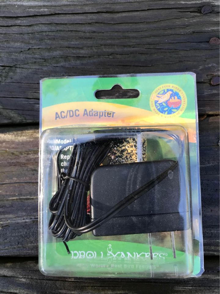 Then I thought of the backyard birds. The Droll Yankee Flipper bird feeder deterred the wiliest squirrels from stealing seed. The motor activated and turned the perching area flipping off heavier than songbird critters attempting to feed. The motor needed a battery and the battery needed a charger.