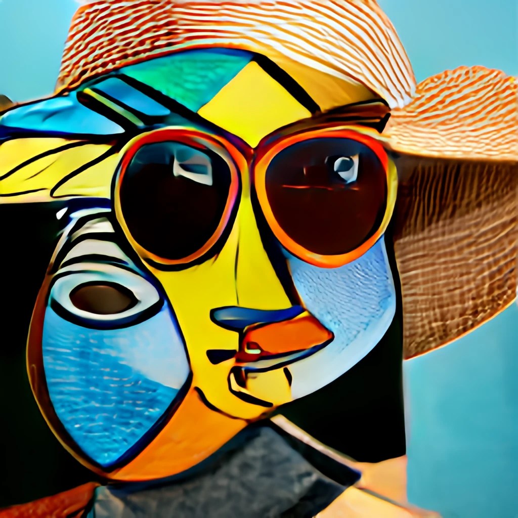 Experimenting with a selfie, I instructed AI to form the image “head and shoulders of a woman wearing red sunglasses and a straw hat.” One of them is in the “style of a cartoon” and the other is in the “style of Picasso.” Although all three appealed to me for different reasons, the selfie was favored.
