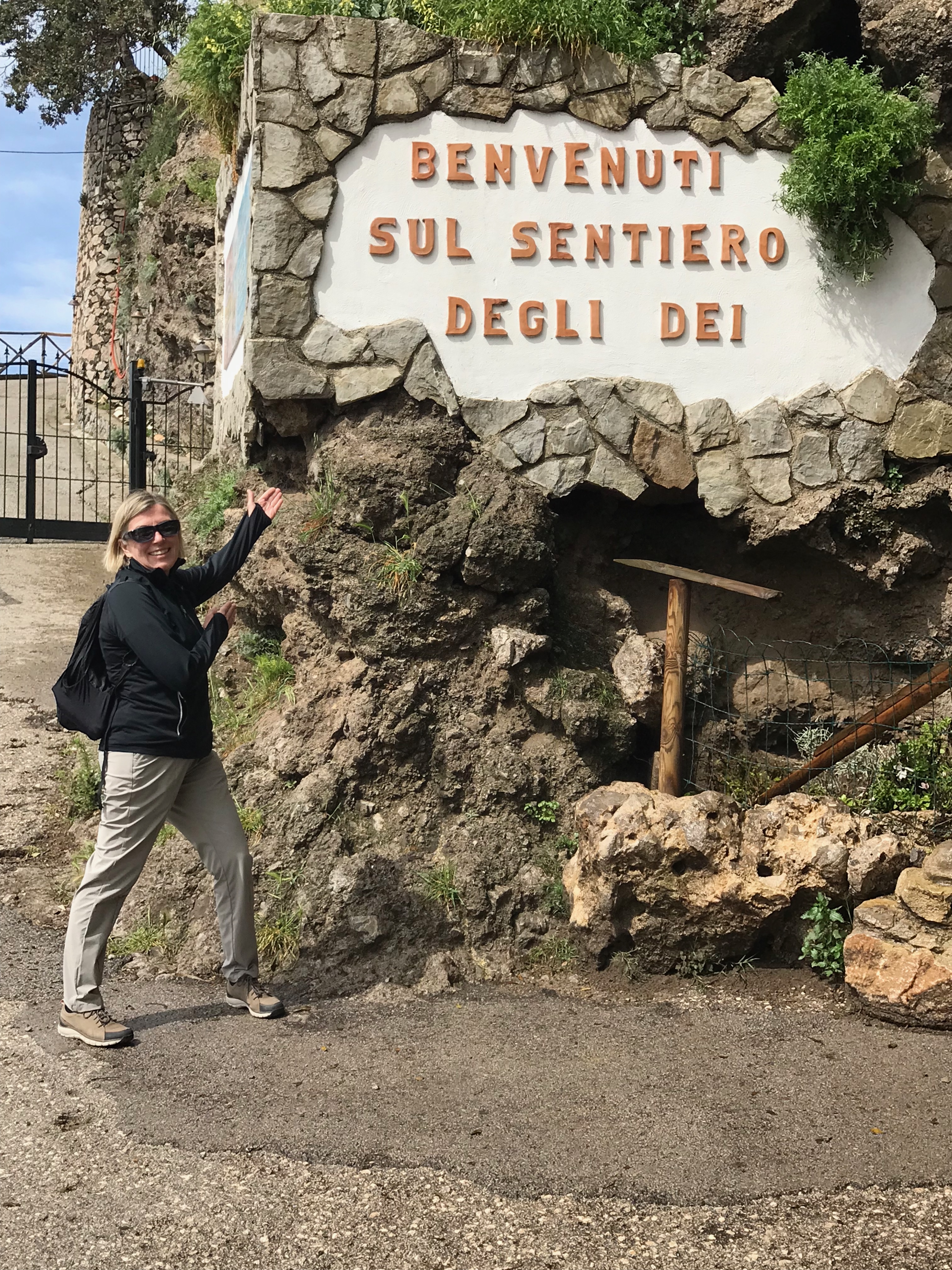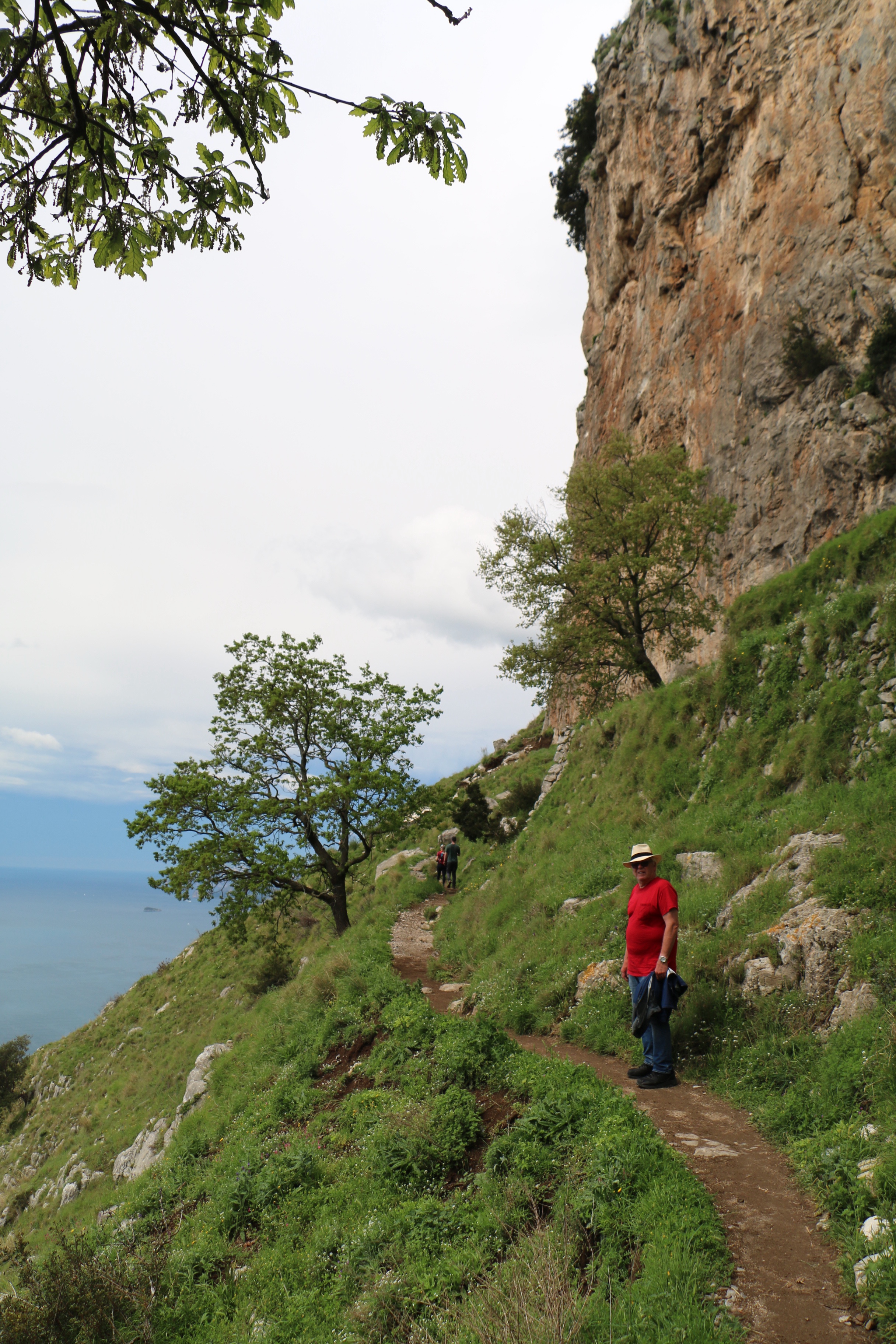 Before attempting The Path Of The Gods hike along the Amalfi Coast, Mike and I diligently researched the trail. Neither of us wanted a Samaria Gorge repeat. Convinced that the 6 km path from Bomerano to Nocelle within our skill set we committed to the outing. I envisioned a short incline, a mostly level 5.5 trail, and an ending decline. My vision clouded at the trailhead where a group of hikers met GUIDES, carried HIKING sticks, and munched PROTEIN bars to sustain them for the ordeal. Mike and I each had a bottle of water and a packet of peanut M&M’s in our pockets. What did they know that we didn’t? A lot! The trail dipped and rose (more rising than dipping) when it didn’t require rock scrambling.